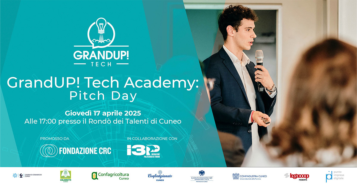 E' tempo di Pitch Day! Il percorso GrandUP! Tech Academy 2024-2025 è giunto al termine e come ogni anno i progetti partecipanti presenteranno al pubblico le loro soluzioni innovative durante l'evento del 17 aprile 2025 presso il Rondò dei Talenti a Cuneo. Non mancare, scopri le startup di Cuneo!